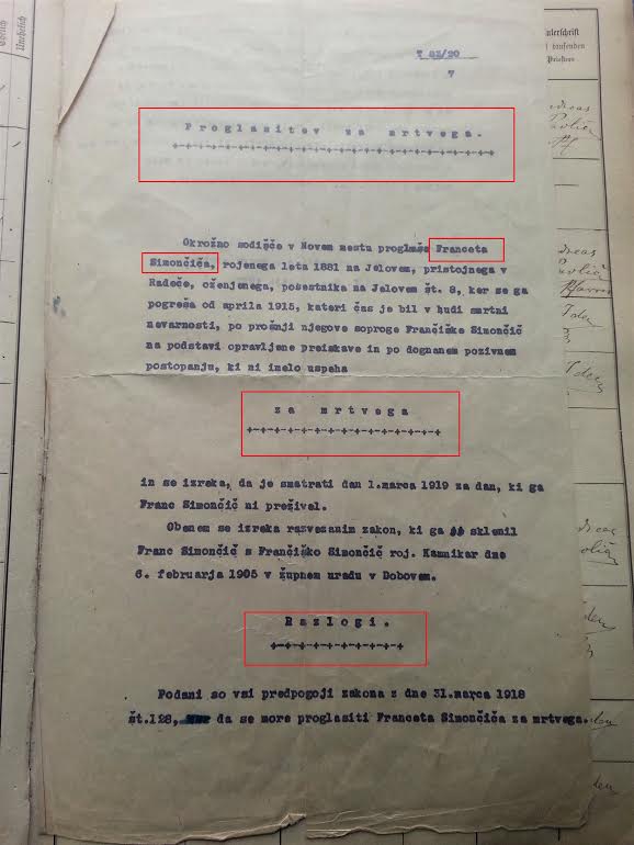 Tako se je zgodilo tudi Francetu Simoniču, ki je bil rojen leta 1881 na Jalovem v Radečah. Pogrešan je bil od aprila leta 1915, leta 1921 pa so se na sodišču v Novem mestu odločili, da ga razglasijo za mrtvega. Razglasitev je pomenila tudi razveljavitev zakona, ki sta ga Franc Simonič in Frančiška Kamnikar sklenila leta 1905, brez tega se namreč žena v prihodnosti ne bi mogla ponovno poročiti.