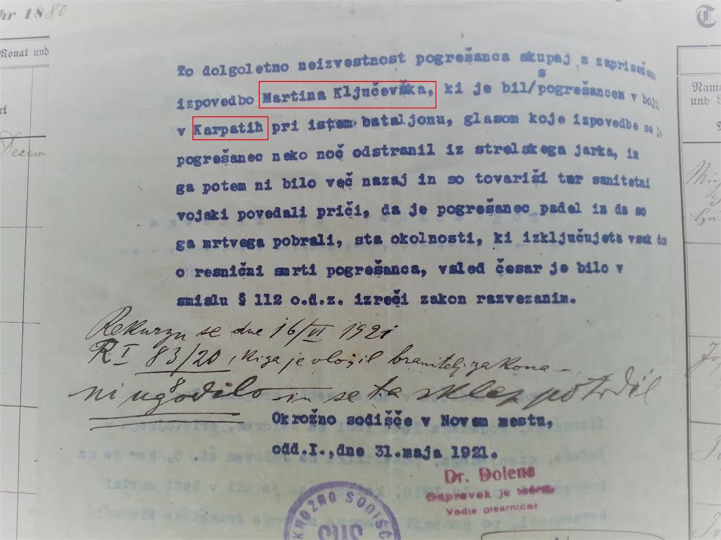 Na zadnji strani dokumenta lahko najdemo podatek, na podlagi katerega so pogrešanca razglasili za mrtvega. To je bilo pričanje soborca Martina Ključevška, ki je bil skupaj s Francem v istem bataljonu v Karpatih. Neko noč se je Franc umaknil iz strelskega jarka, kamor se ni več vrnil. Sanitetni vojaki ter ostali so Martinu kasneje sporočili, da je pogrešanec padel in so ga našli mrtvega. Tako so izključili dvom, da bi Franc Simonič preživel prvo svetovno vojno, kljub temu pa so kot zadnji mesec, ki ga je še lahko doživel, določili februar 1919.